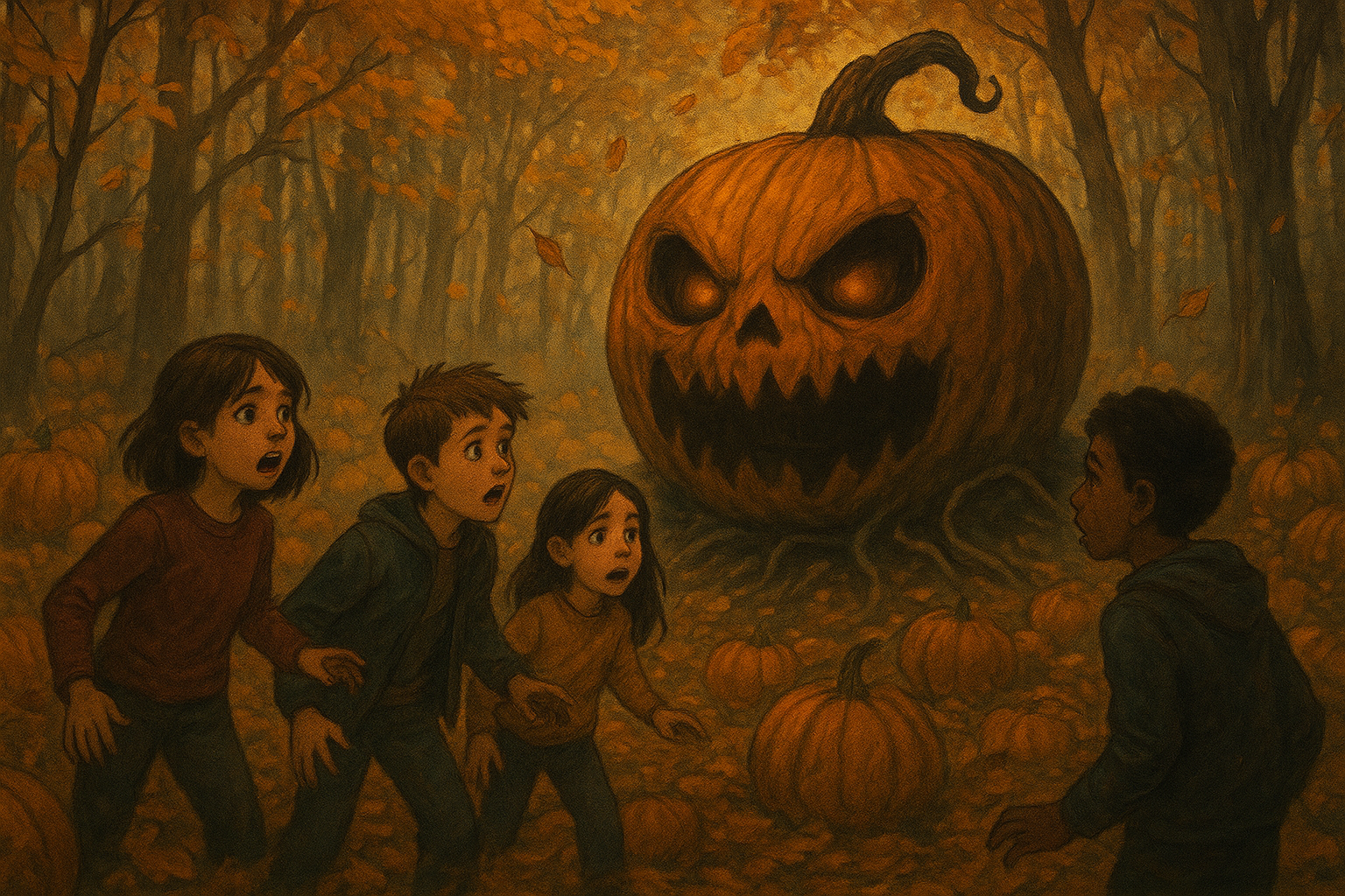 Un groupe d’amis part jouer dans une forêt d’automne remplie de citrouilles, mais ils découvrent une citrouille géante terrifiante. Grâce à leur courage et leur amitié, ils parviennent à s’en sortir et gardent ce souvenir comme une aventure inoubliable.