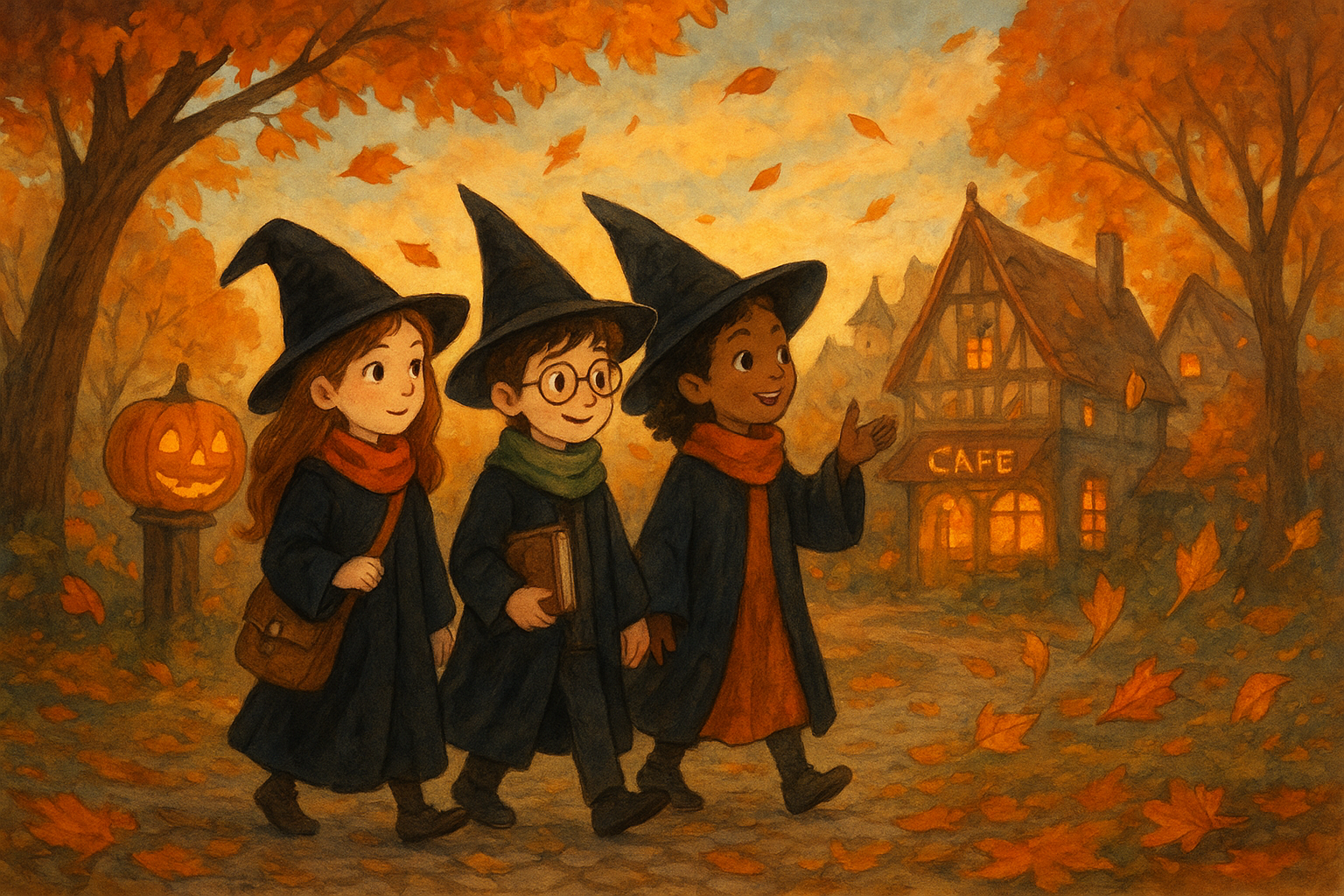 Trois enfants magiciens, Élise, Thomas et Naya, découvrent la Colonie des Feuilles d’Or où ils apprennent la magie d’automne. Ils explorent un village enchanté, dégustent des boissons chaudes dans un café chaleureux et participent à la Nuit des Feuilles Dansantes, une fête magique inoubliable.